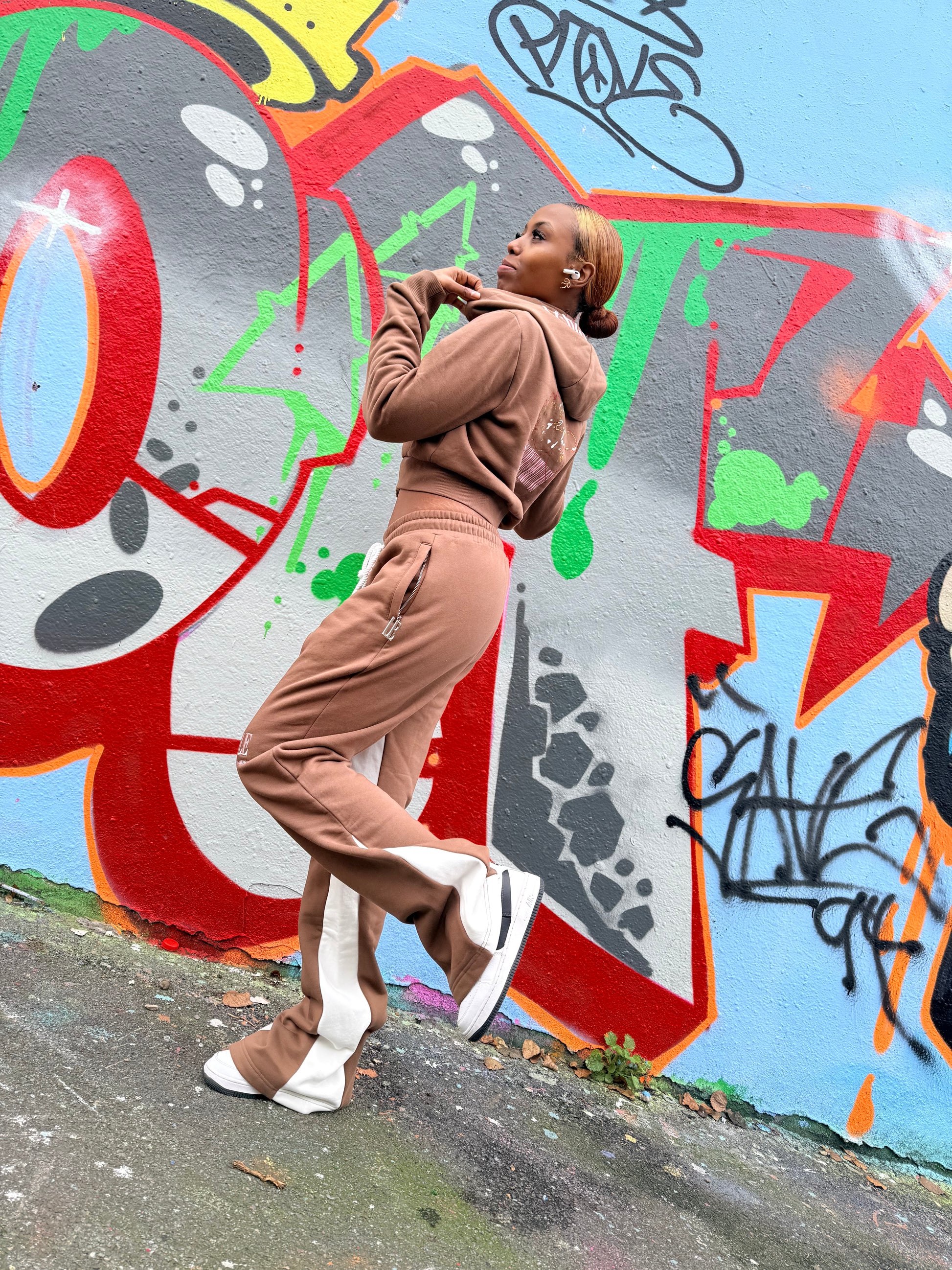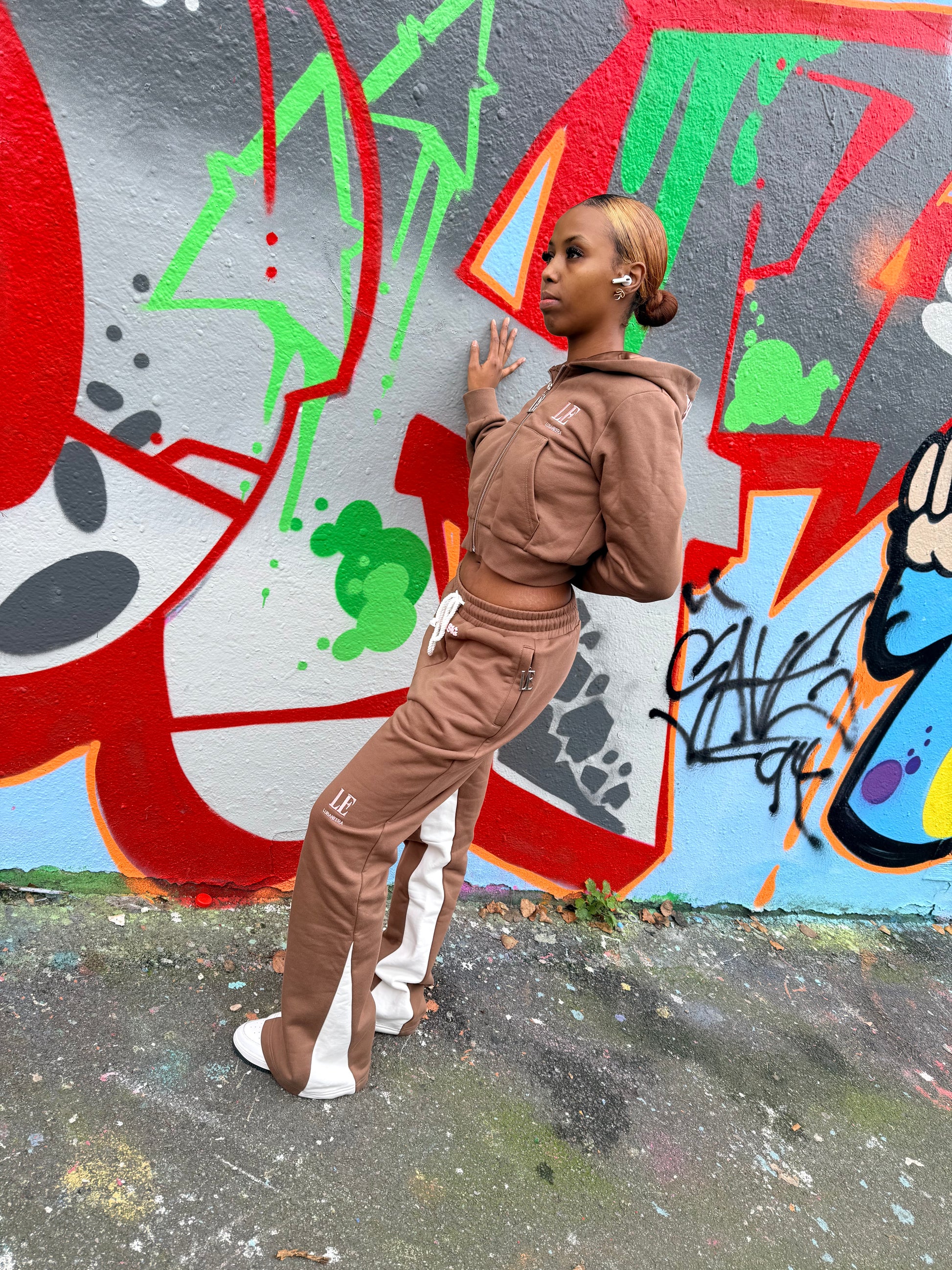 The cropped hoodie features a double-lined hood, premium metal zip and refined LE Lubanè Era chest embroidery. Paired with our sculpting wide-leg, high-waisted bottoms, the set elongates the silhouette and offers full movement while maintaining a tailored, flattering fit. Functional zip pockets, contrast side panels and our signature artwork at the back add a distinctive, fashion-forward finish.
