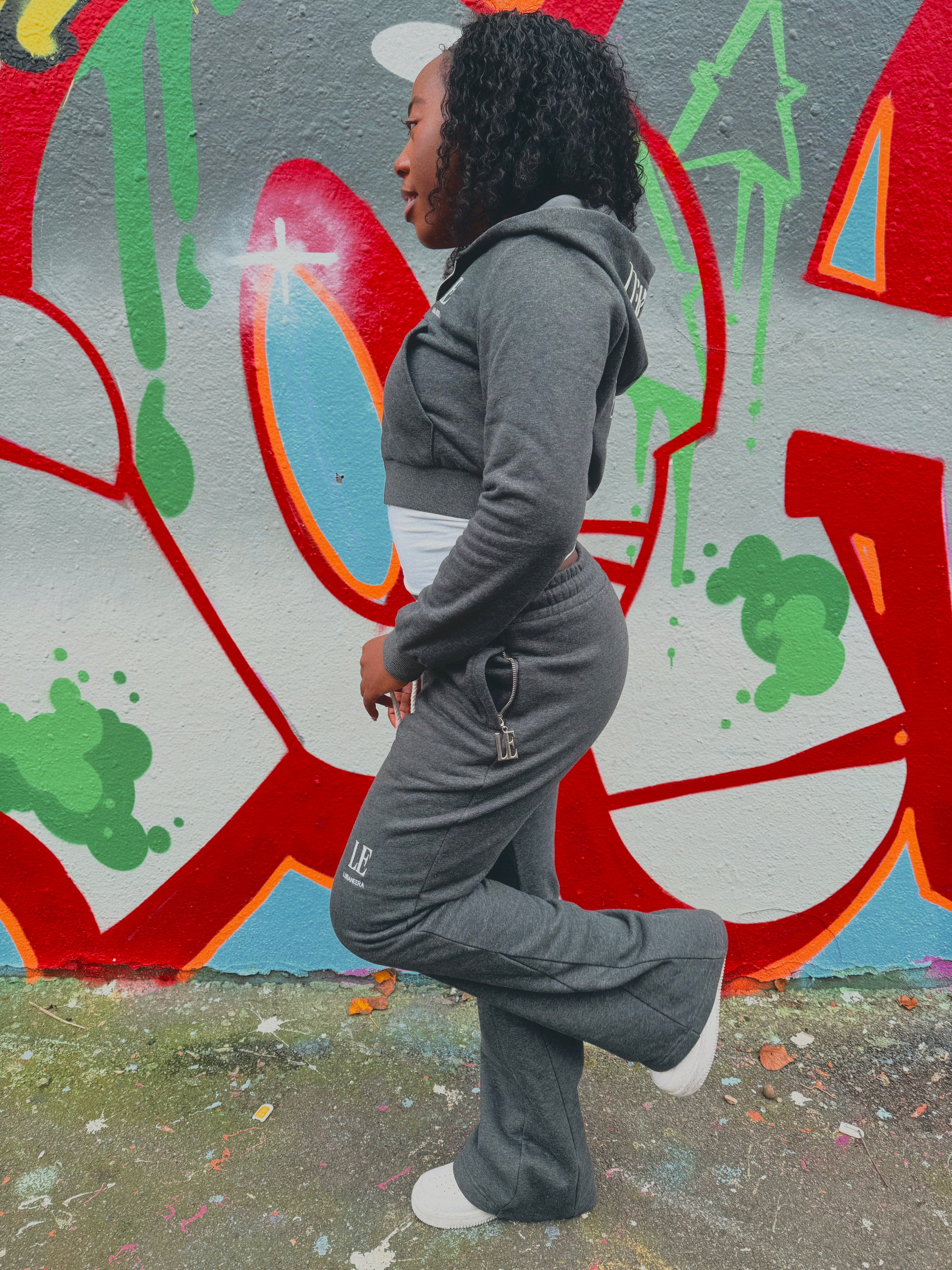 The cropped hoodie features a double-lined hood, premium metal zip and refined LE Lubanè Era chest embroidery. Paired with our sculpting wide-leg, high-waisted bottoms, the set elongates the silhouette and offers full movement while maintaining a tailored, flattering fit. Functional zip pockets, contrast side panels and our signature artwork at the back add a distinctive, fashion-forward finish.